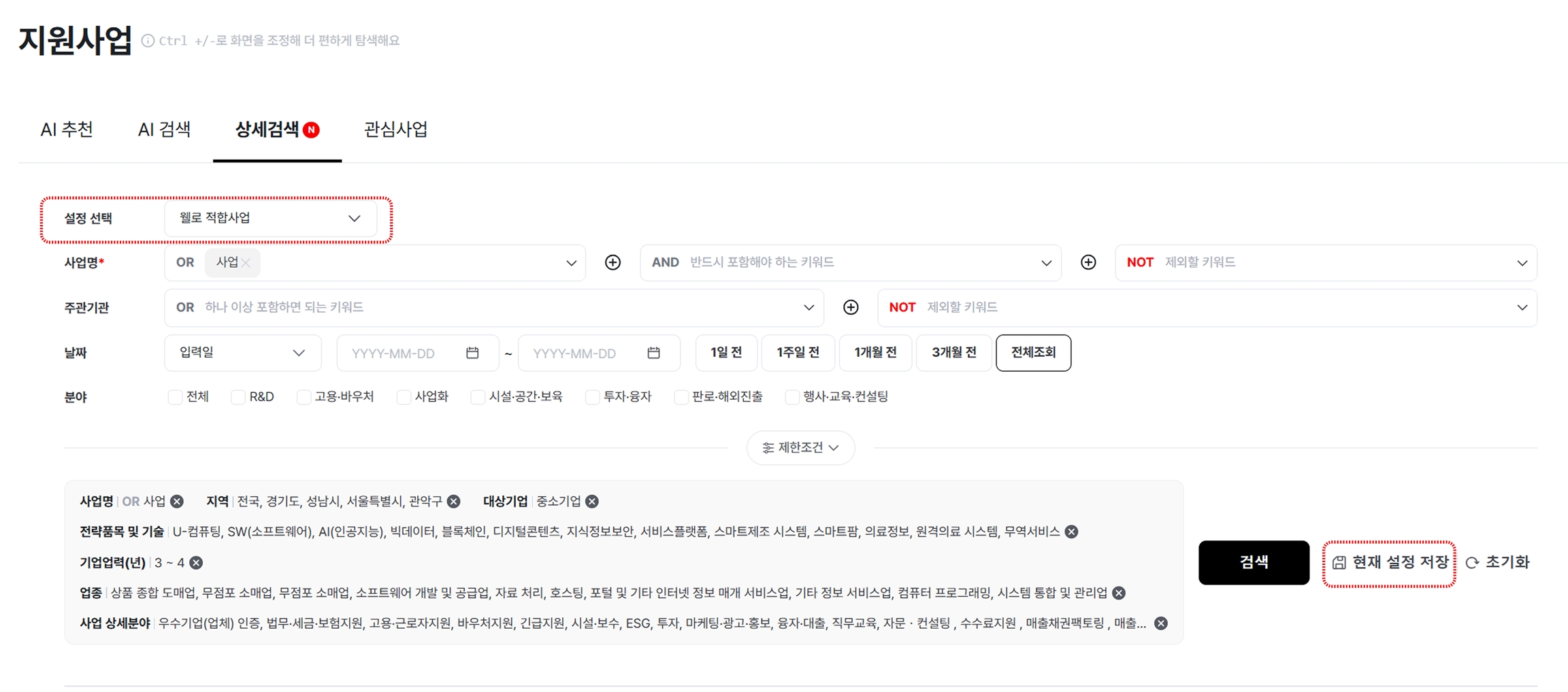 저장방법: 검색조건 입력 → 우측 하단 '현재설정저장' 버튼 클릭 → 저장된 검색 설정은 '설정 선택'에서 선택하여 사용할 수 있습니다.